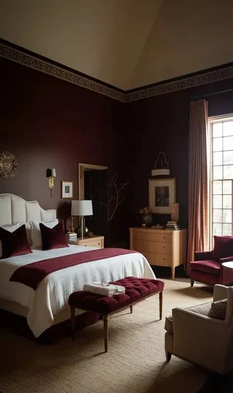 If a full wall of burgundy feels too intense, opt for an accent wall behind your bed. This draws the eye and adds a focal point without overwhelming the room.